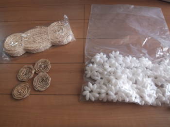 シェルは1個¥300です。手前にある、ラウハラ(天然)で作られたバラは1個¥500、巻いてあるラウハラはヘッドに巻きます。頭のサイズに関わらず¥1000です。