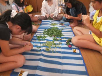 はさみを使用するので、一番小さなKeiをAcoの隣にしました。まずは、レジャーシートをみんなで敷き、花を茎と葉と花に分けて切っていく作業からしました。針も使用するので、必ず、使ったら小さな針刺しにさしておくこととし、みんなの個性がでるように、好きなように作らせました。