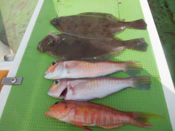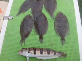 赤ボラ(画像一番下の魚)も良型で人によってはアマダイよりおいしいと言う人もいるみたいです。アマダイは刺身にすると、水水しいです。そして残念ヒラメは釣れず。今日の釣果はカレイのデカイの2匹と普通サイズのカレイ10匹、赤ボラ2匹 アマダイ3匹 トラギスの15センチ級1匹 いわし2匹 鬼カサゴ1匹 カナガシラ5匹でした。