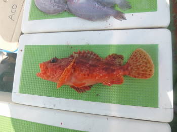 最後に来ました!鬼カサゴ。背びれとエラに毒があるので、すぐにはさみで切ります。刺されたら1日ビリビリ痛いそうですよ。これは処理済です。外道もあまりかからず、アマダイも終わりの時期に来ているので、今日は茅ヶ崎一俊丸に乗りましたが、まあまあの釣果ではないでしょうか?本命はアマダイ・第二本名は赤ボラだったんですが、とにかくカレイが多かった。鬼カサゴは高級魚ですよ~!カレイだって、20センチサイズ2匹に関しては結構値段は付きますよ!