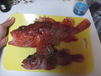 根魚の中でも高級魚として知られる鬼カサゴ!下のが普通サイズ、上のは40センチオーバーです。捨てるところのない魚なので、釣り好きにはたまらない魚です。あのうねりの中、よく釣れました。最後の1投で、40センチオーバーでした。その他ほとんど下の魚と同じサイズの鬼カサゴ。他キス 赤ボラ