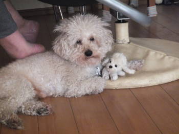 カットに連れて行かなくちゃね!Tプードルのクヒオが自分とおんなじぬいぐるみを抱えていました。胸がキュンキュンしますね!