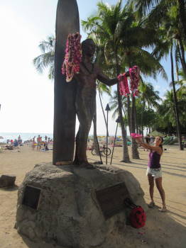 そこに堂々と建つ、この偉大な人。サーフィンの神様Duku Kahanamoku!